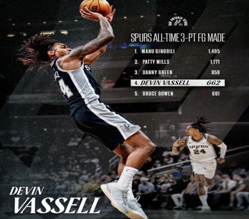 瓦塞尔超越鲍文!升至马刺队史三分榜第四位